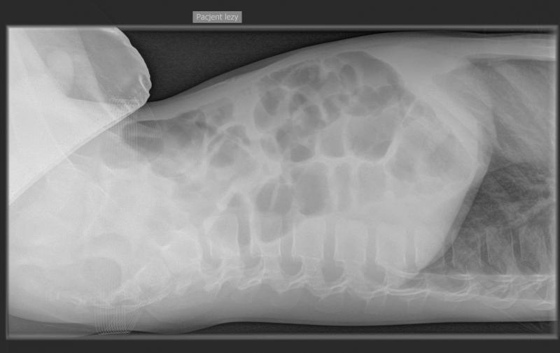 Rozpoznanie: Liczne poziomy płynu w dystalnych pętlach jelita cienkiego oraz w miernie rozdętym jelicie grubym do wysokości zstępnicy, brak powietrza w rzucie odbytnicy - cechy niedrożności. Bez cech perforacji.
