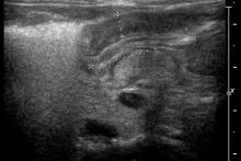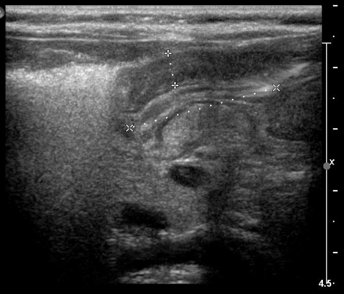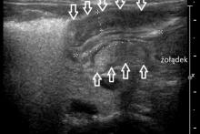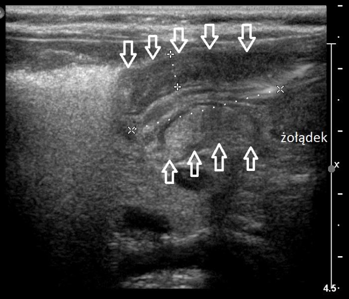 Rozpoznanie: W badaniu usg - pogrubiała mięśniówka odźwernika, kanał odźwiernika szczelinowaty. Przerostowe zwężenie odźwiernika (pylorostenoza).