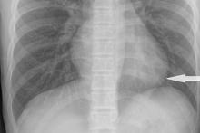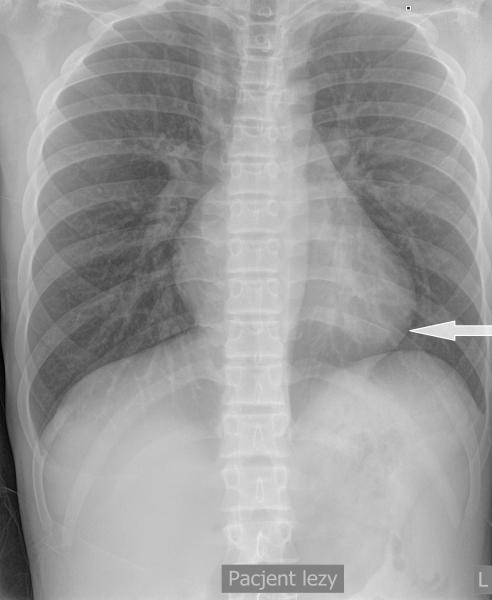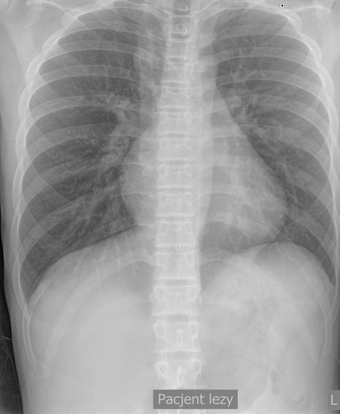 Rozpoznanie: W badaniu RTG klatki piersiowej - złamanie tylnego odcinka żebra X lewego, poza tym bez nieprawidłowości.