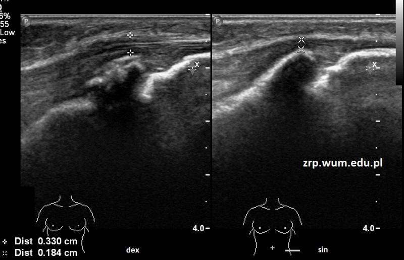 Rozpoznanie: W badaniu USG uwidoczniono nierówny zarys guzowatości kości piszczelowej prawej, z pogrubieniem i przekrwieniem sąsiednich tkanek miękkich - cechy choroby Osgood-Schlattera. Dla porównania prawidłowy obraz guzowatości lewej kości piszczelowej.