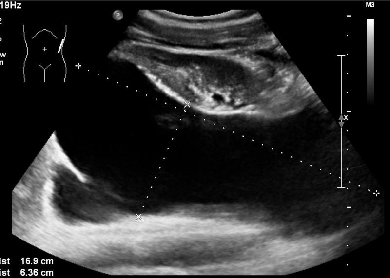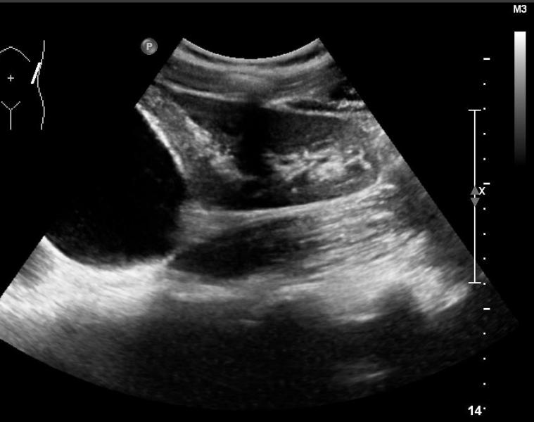 Rozpoznanie: W wykonanym badaniu USG stwierdzono zdwojenie układu kielichowo-miedniczkowego nerki lewej, z wodonerczowo zmienionym górnym układem, o wym. 170x95x64mm; moczowód poszerzony, uchodzi ektopowo. Pacjent zakwalifikowany do heminefrektomii.
