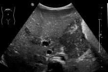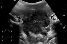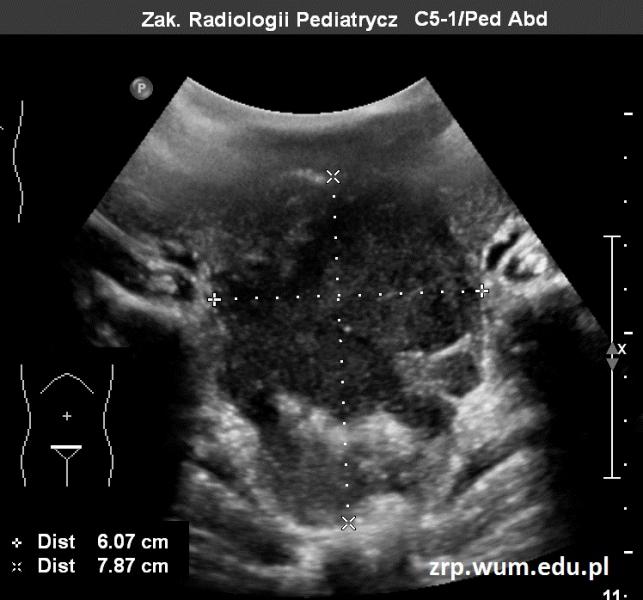 Rozpoznanie: W badaniu USG uwidoczniono w jamie brzusznej rozległe masy guzowate (pomiary między kursorami). Skierowany do dalszej diagnostyki.