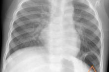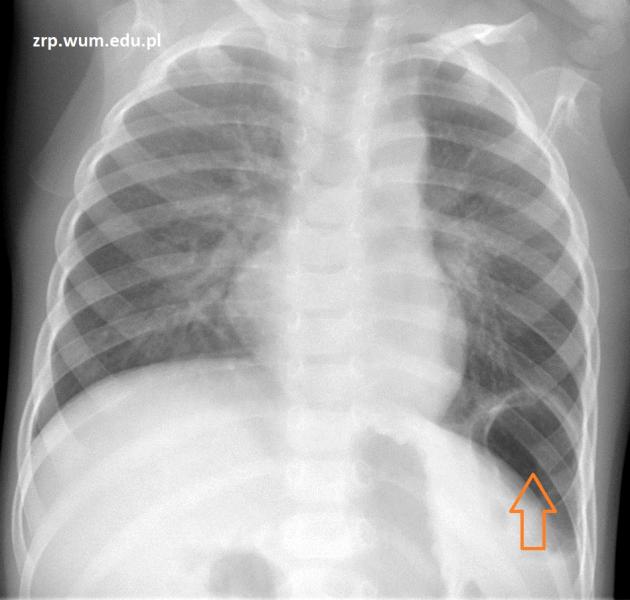 Przypadek 44: U 18-miesięcznego chłopca po operacji przepukliny przeponowej lewostronnej (operacja przeprowadzona po urodzeniu) wykonano kontrolne zdjęcie rtg klatki piersiowej.