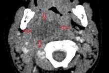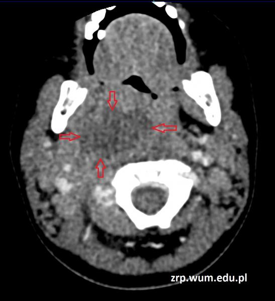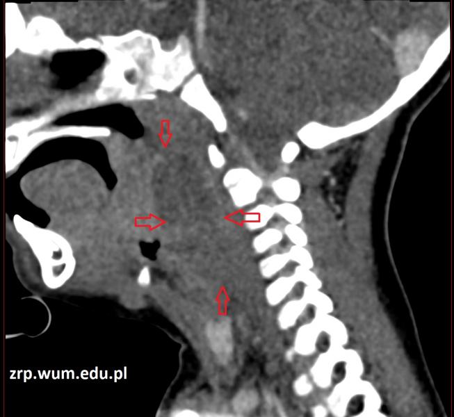 Rozpoznanie: W badaniu tomografii komputerowej w przestrzeni za- i przygardłowej po stronie prawej widoczny jest neregularny obszar płynowy - ropień (strzałki) - zmiana przemieszcza i modeluje naczynia szyjne, gardło dolne, krtań i przełyk.