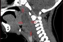 Przypadek 45: 2-letni chłopiec zgłosił się do IP z gorączką i apatią od 5 dni oraz zapaleniem węzłów chłonnych szyi. W badaniu przedmiotowym stwierdzono przesunięcie bocznej ściany gardła po stronie prawej, szczękościsk, przymusowe ustawienie głowy. Wysunięto podejrzenie nacieku zapalnego przestrzeni przygardłowej po stronie prawej. Wykonano TK szyi w celu wykluczenia ropnia pozagardłowego.