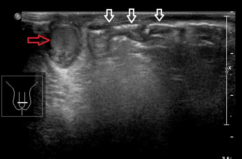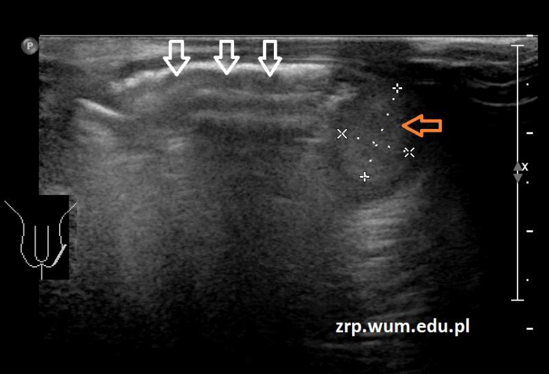 Rozpoznanie: W badaniu usg - uwidoczniono przepuklinę pachwinowę lewostronną - w kanale pachwinowym i w mosznie po stronie lewej widoczne pętle jelitowe (białe strzałki), z zachowaną perystaltyką. Oba jądra widoczne w mosznie, o prawidłowej strukturze i wielkości (czerwona strzałka - jądro prawe, pomarańczowa strzałka - jądro lewe, widoczne poniżej pętli jelitowych).