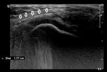 Rozpoznanie: W badaniu usg uwidoczniono linijne ciało obce - igłę (strzałki) - w tkankach miękkich bocznej części kolana.