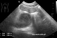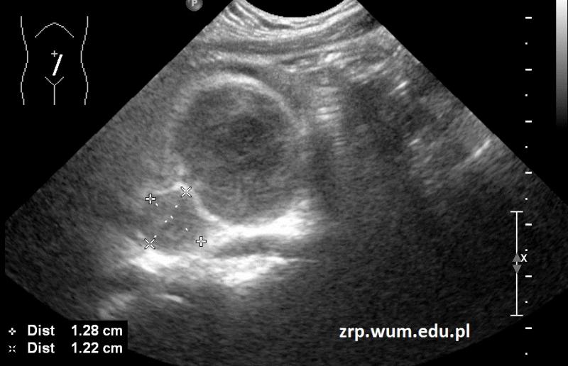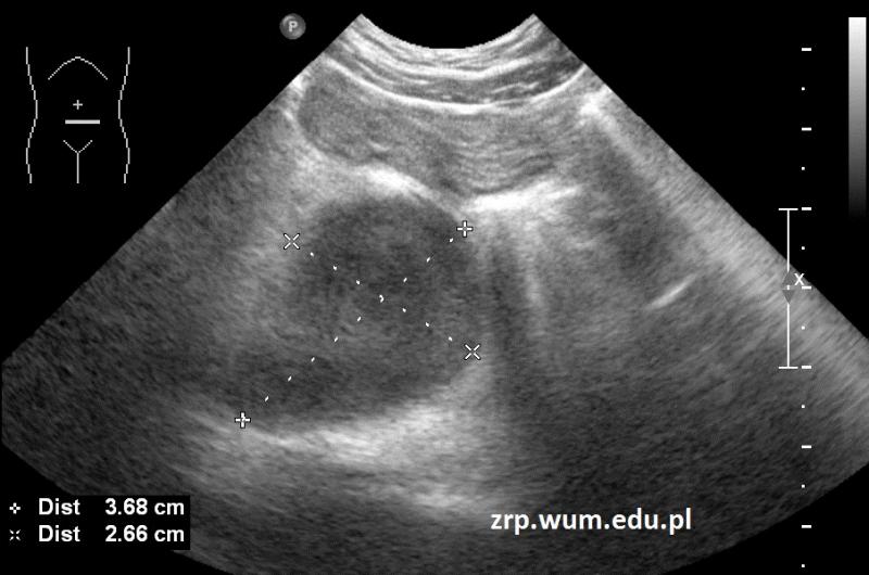 Rozpoznanie: W badaniu USG w śródbrzuszu, pod pępkiem, uwidoczniono dwie hipoechogenne owalne zmiany, o wym. 37x27x22mm i 13x12mm, na tej podstawie wysunięto podejrzenie chłoniaka. Potwierdzono rozpoznanie chłoniaka Burkitta