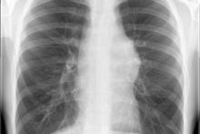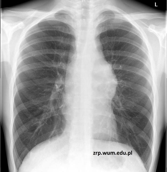 Rozpoznanie: Na zdjęciu RTG klatki piersiowej stwierdzono poszerzenie cienia śródpiersia po stronie lewej, w rzucie lewej wnęki. W trakcie dalszej diagnostyki rozpoznano chłoniaka.