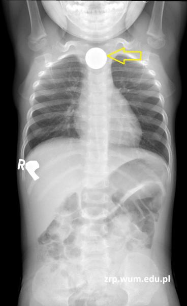 Rozpoznanie: Wykonano badanie RTG klatki piersiowej i jamy brzusznej - uwidoczniono okrągłe cieniujące ciało obce średnicy ok. 25 mm, rzutujące się na wysokości trzonów kręgów C7-Th2 (żółta strzałka).