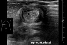 Rozpoznanie: W badaniu USG w okolicy podwątrobowej uwidoczniono czoło wgłobienia krętniczo-kątniczego. Przy czole wgłobienia kilka drobnych węzłów chłonnych. Wykonano udaną próbę odgłobienia wlewem wodnym.
